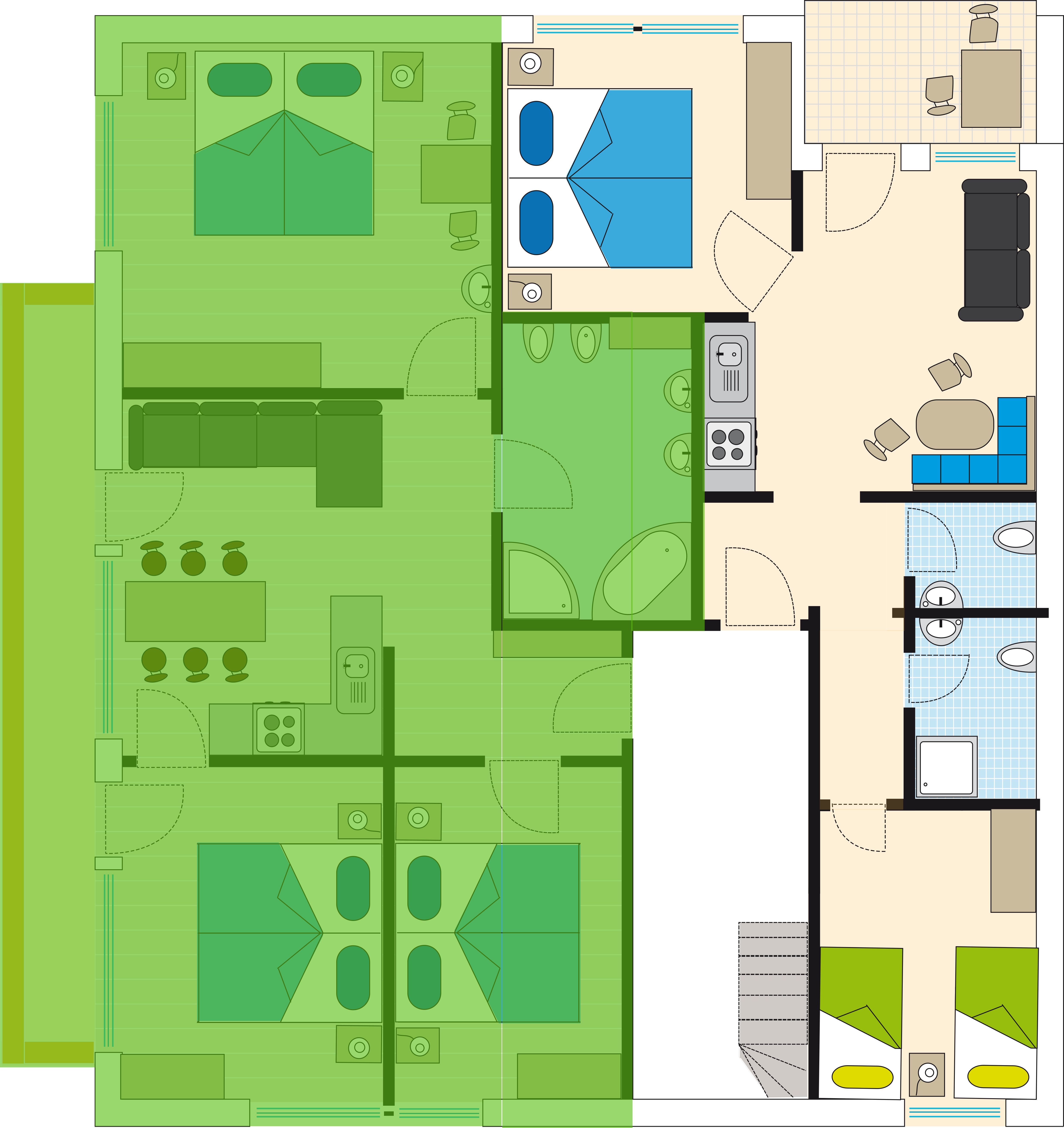 Die Wohnung liegt in 1.Obergeschoß des Hofgebäudes und ist mit 65 qm geeignet für 4